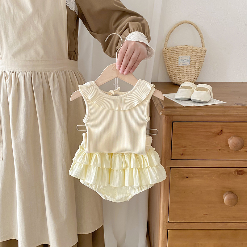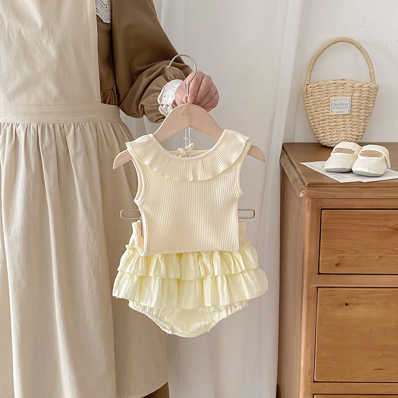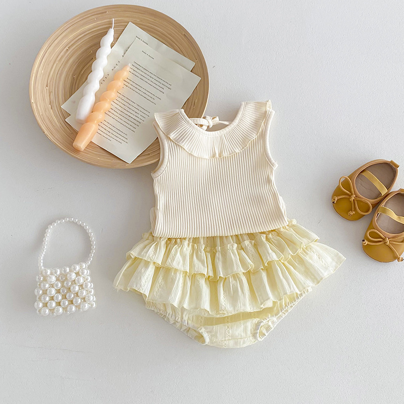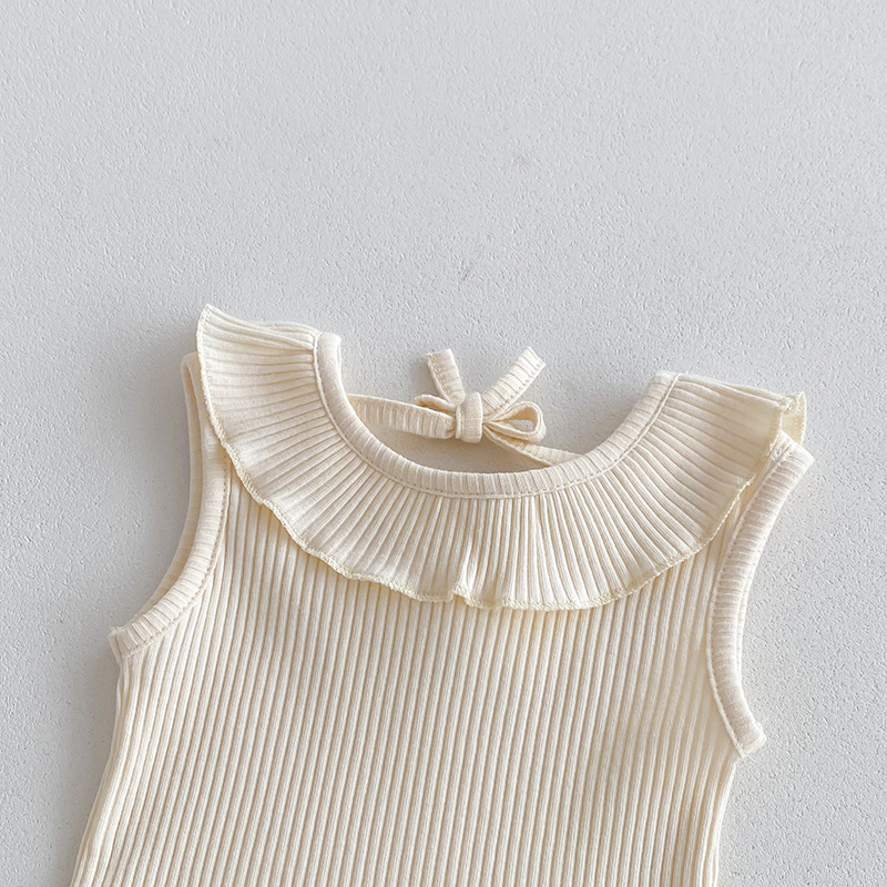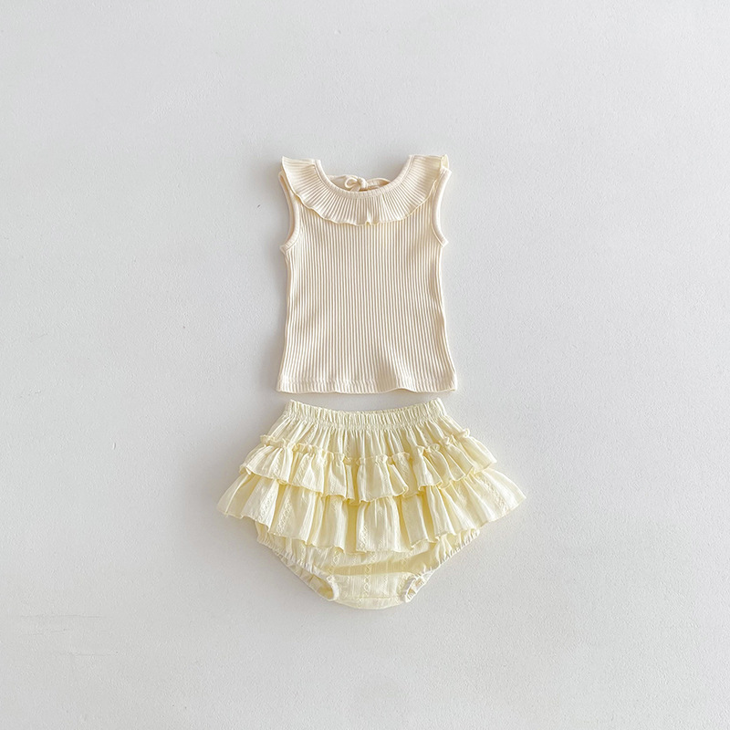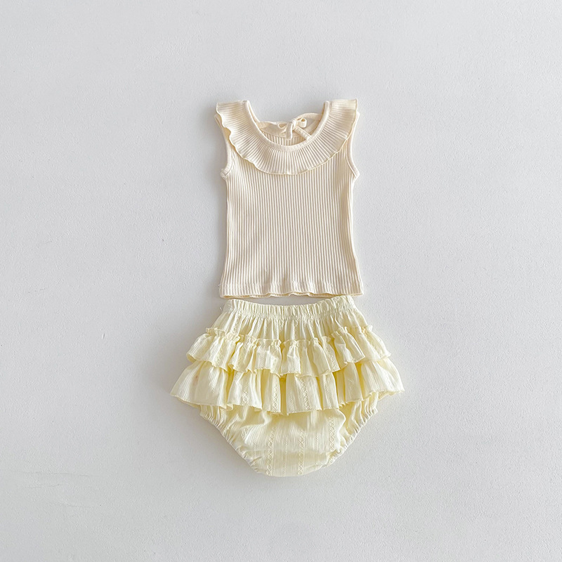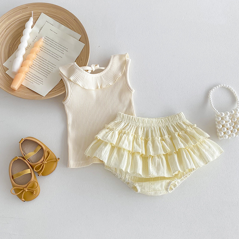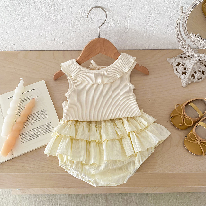 Color: beige backless sleeveless ruffled collar top, beige hundred pages double layer Bud waist shorts