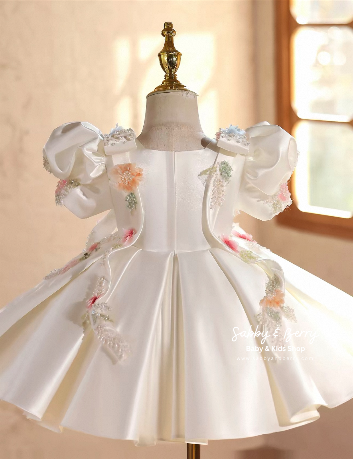• Embellishments: Intricate 3D floral appliqués in pastel pinks, blues, and peaches trail across the bodice and skirt. Hand-beaded pearls and delicate embroidery mimic a garden in bloom.