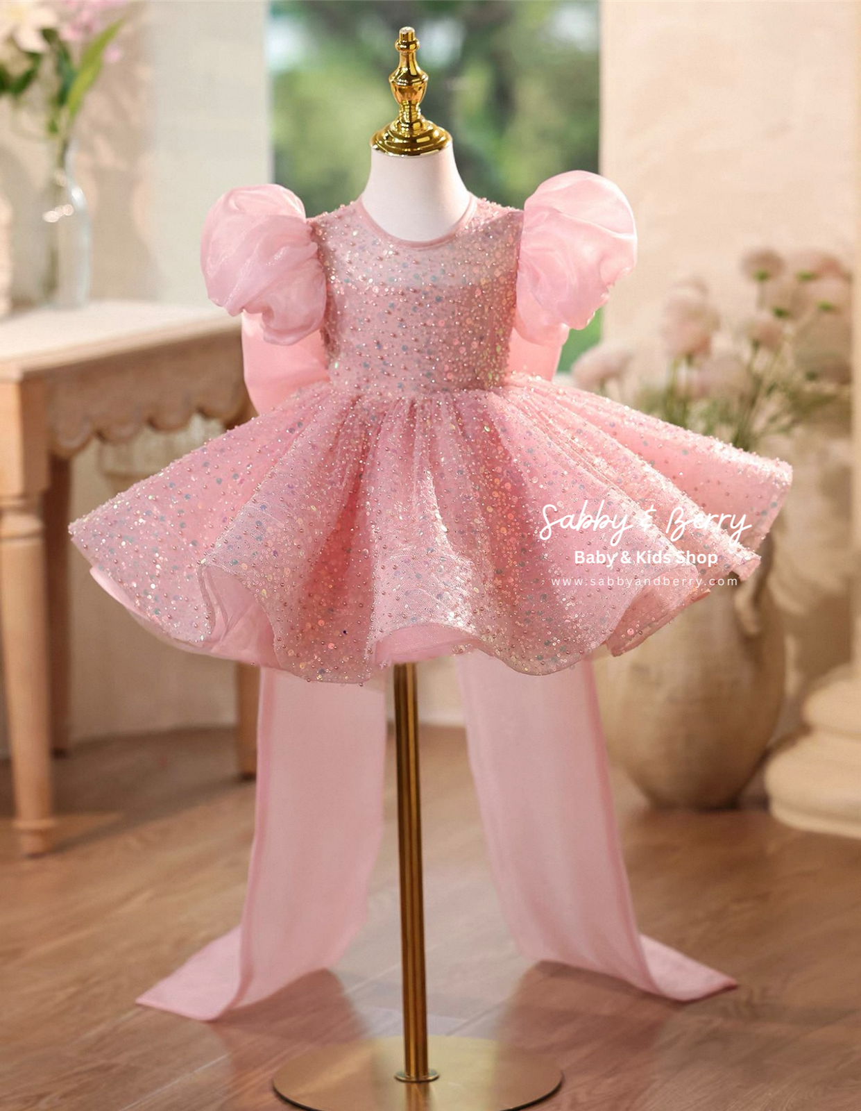This Pink Stardust Princess Dress is a vision of sparkling charm, perfect for making a grand entrance. The entire garment is bathed in a soft rose hue and covered in all-over shimmering sequins that create a dazzling, multi-dimensional effect with every movement.